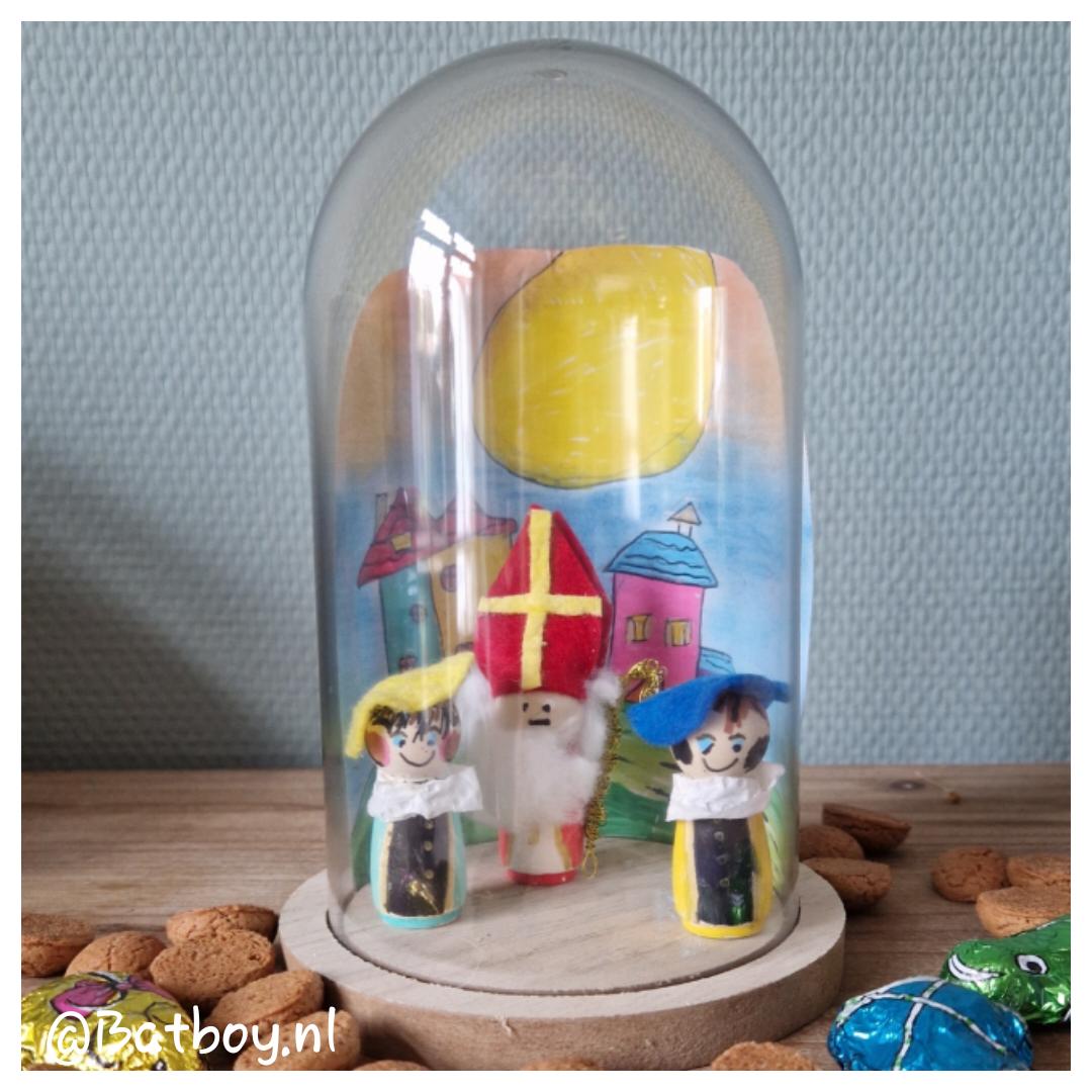 Zet de figuurtjes samen op een houten schijfje, plankje of onder een stolp. Om de stolp te versieren laat je kind dan een tekening maken met bijvoorbeeld huisjes en plak deze aan de binnenkant van de stolp. Zo krijgt het nog meer diepte! Zet het op de vensterbank of als tafeldecoratie. Zo maak je een mini-Sinterklaas tafereeltje.
