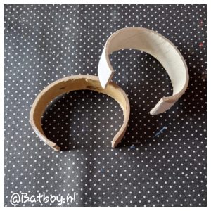 Voor de handen hebben we lege plakbandrollen gebruikt, bijvoorbeeld van ducttape. Deze ingeknipt en geel geverfd.