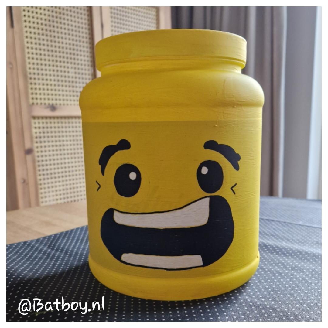Voor het hoofd hebben we een grote plastic pot gebruikt waar eiwitpoeder in heeft gezeten. Deze pot is echt perfect, want het heeft zelfs al de vorm van een Lego hoofd. Hier gaan ook de cadeautjes in.